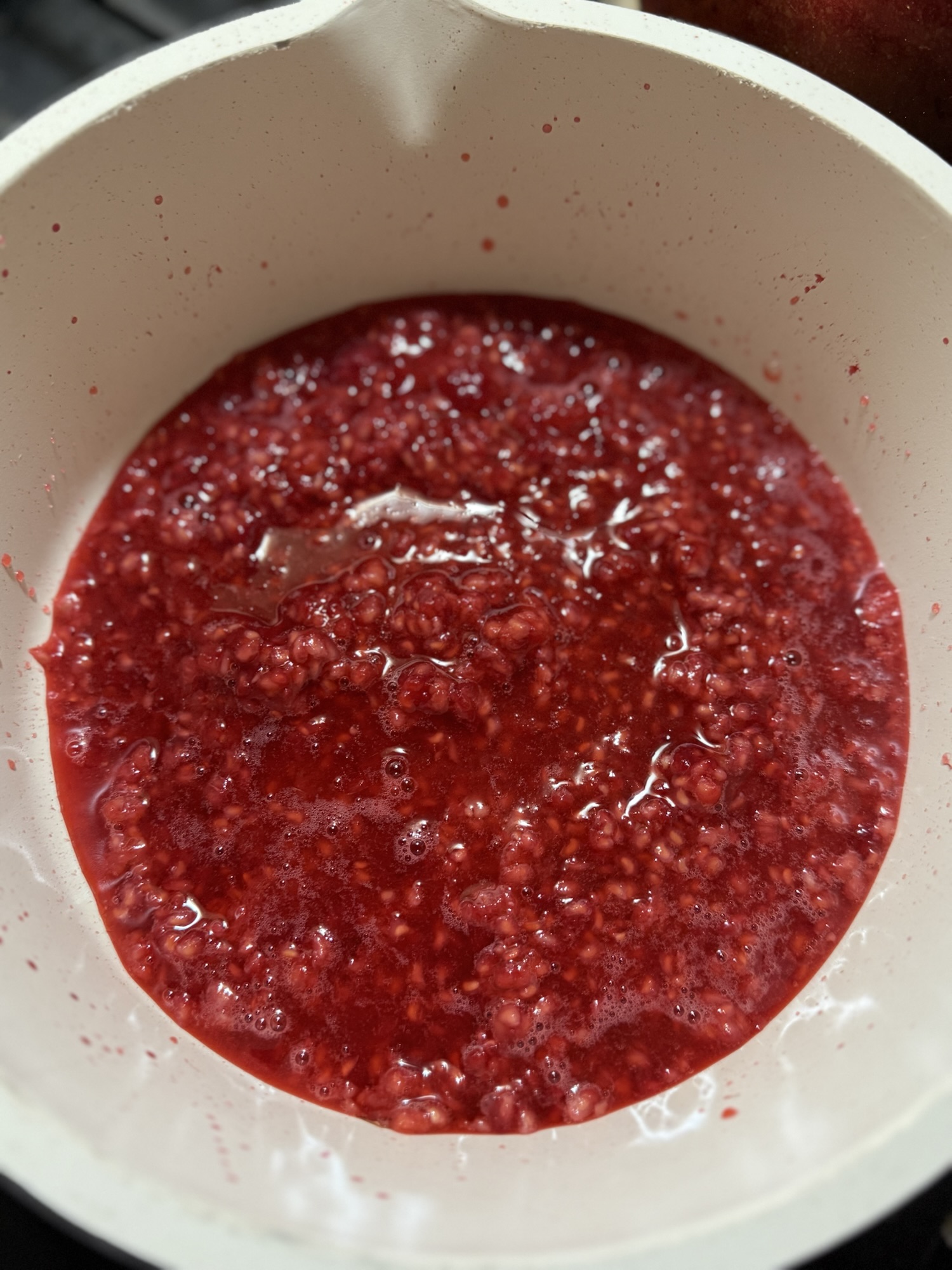 Put the raspberries in a pot and heat until you can mash them up with a potato masher. Warning: warm raspberries smell nasty! I was convinced I did something wrong.